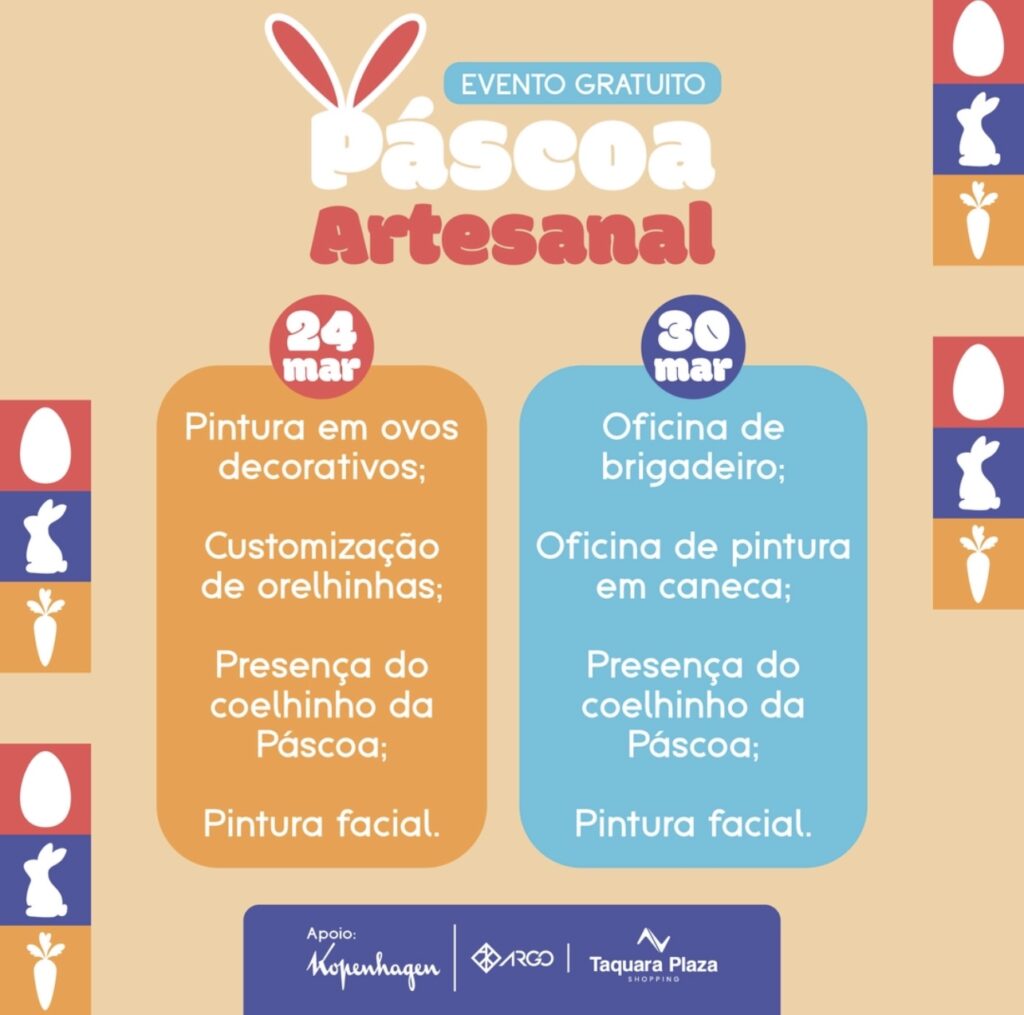 Para comemorar a Páscoa em grande estilo, o Shopping Taquara Plaza vai promover dois dias de pura gostosura e diversas atividades para as crianças de 3 a 11 anos de idade, nos dias 24 de março (domingo) e 30 de março (sábado), às 15h, no clubinho Taquara (3º piso). A entrada é franca.