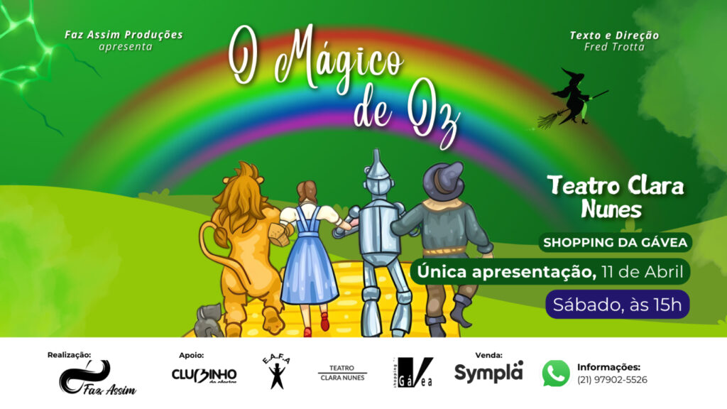 Sinopse – Em um dia comum em sua fazenda no Kansas, a menina Dorothy se depara com uma grande aventura. Através de um furacão é levada para o Mundo de Oz, onde entrará em uma incrível jornada para encontrar o caminho de casa. Contudo, ela não estará sozinha. Ao longo do caminho fará amigos que não apenas a ajudarão, como também irão descobrir muito sobre eles mesmos nessa longa estrada de tijolos amarelos. Com canções que encantam gerações, venha viajar com Dorothy e seus amigos para encontrar o caminho de volta para casa.
