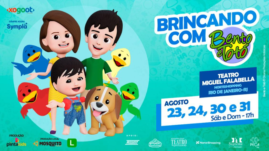 Sinopse – Bento e Totó. Sucesso estrondoso no YouTube, Bento, Totó e sua turma, se apresentam no teatro com o espetáculo “Brincando com o Bento”. Prepare-se para um dia repleto de brincadeiras e diversão! Junte-se a nós nessa aventura emocionante para resolver um mistério e celebrar o aniversário do Bento! Venha se divertir em um show cheio de música,surpresas, interação com o público e um cenário encantador. Sucessos como Funk do Patinho e Patinho Colorido, são garantidos! O musical tem produção da Plinta Kids, Mosquito Produções em parceria com o Estúdio Xogoot.