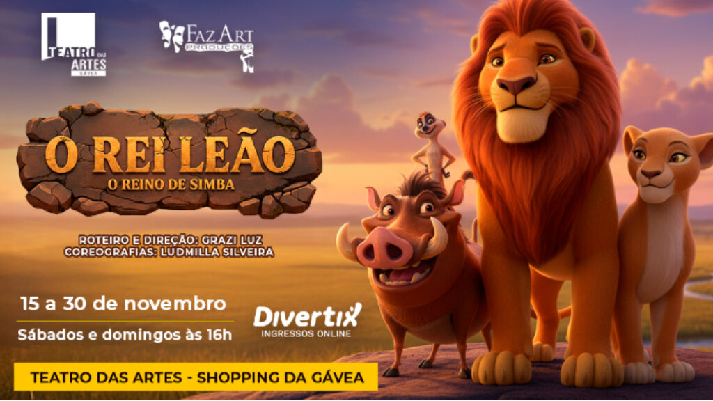 – um musical infantil que conta a história de Simba, um pequeno leãozinho que é filho do rei Mufasa e da rainha Sarabi. Ao crescer, é envolvido nas artimanhas de seu tio Scar, o invejoso e maquiavélico irmão de Mufasa, que planeja livrar-se do sobrinho e assumir o trono. Quando Simba se vê injustamente acusado pela morte de seu pai, ele foge para bem longe, onde encontra um javali chamado Pumba e um suricate chamado Timão, que passam a ser seus melhores amigos e lhe ensinam a filosofia do “Hakuna Matata” (sem preocupações). Anos depois, ele reencontra Nala, sua amiga de infância, que através do seu amor tenta o convencer de de voltar e retomar seu lugar como rei.