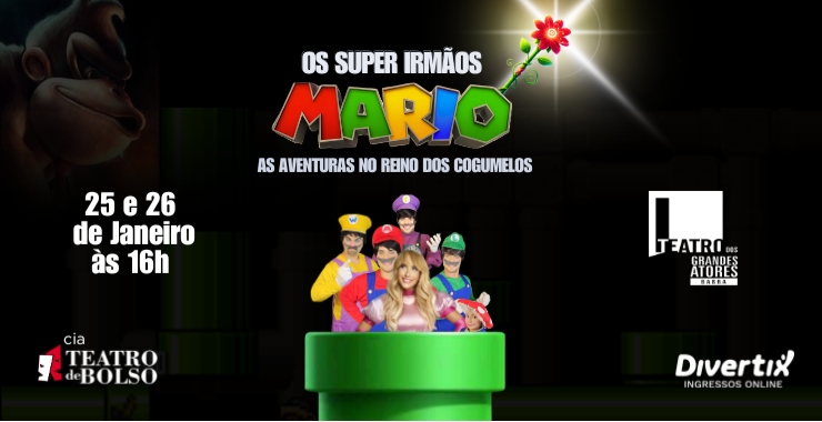 Sinopse – Os mundos do teatro e dos games se encontram na emocionante adaptação teatral. O espetáculo que traz os queridos personagens Mario, Luigi e Princesa Peach à vida. Combina humor, ação e momentos emocionantes, prometendo encantar públicos de todas as idades. Na trama, Mario e Luigi têm seu dia de descanso interrompido quando um poderoso artefato mágico, a Varinha Redflower, é confiado à Princesa Peach pelo grande mago Kinoko. Mas a tranquilidade do Reino dos Cogumelos está ameaçada: Wario, o astuto rival, trama roubar a varinha para seus planos perversos. Em meio a confusões, perseguições e batalhas épicas, Mario, Luigi, Peach e o adorável Toad precisam trabalhar juntos para proteger a varinha e salvar o reino.