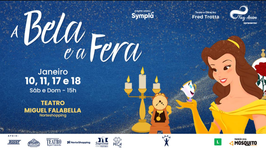 Sinopse – O clássico que encanta gerações ganha vida na mais nova montagem da Cia de Artes Faz Assim. O novo espetáculo A Bela e a Fera se destaca pelos figurinos e lindas canções. O espetáculo promete transportar o público para um lugar onde o valor interior é que realmente importa. Bela, uma jovem inteligente, corajosa, que troca sua liberdade pela do pai e passa a viver no castelo de uma misteriosa Fera. Com o tempo, ela descobre que além da aparência há um coração bondoso e generoso.